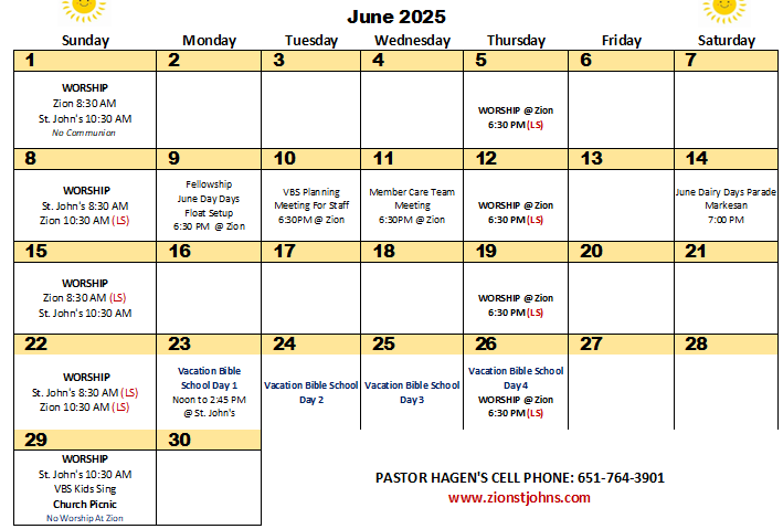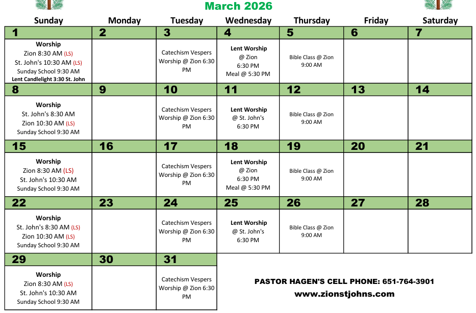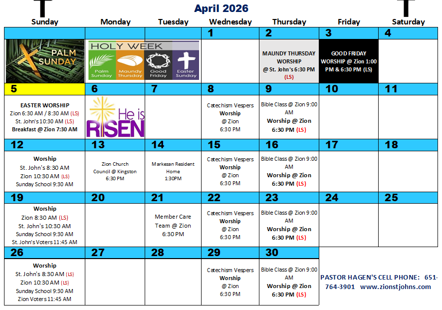 5th Sunday of the month - 8:30 at Zion, 10:30 at St. John's.